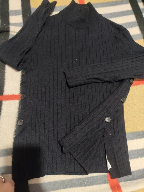Свитер от Zara водолазка бадлон гольф темно синий, черно-синий 50% вовна/шерсть с разрезами по бокам на пуговицах достаточно узкий рукав на худи руки 32 плечи 40 под руками 54 рукав