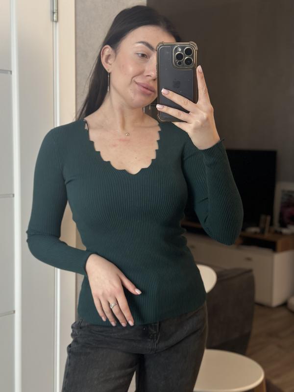 Гольфік з фігурною горловиною у дуже красивому кольору бутилка. Темно зелений. Універсальна річ, яка має бути у гардеробі кожної красуні