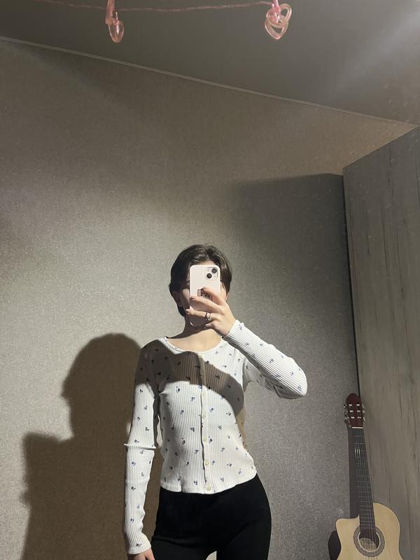 Базовая кофта на пуговицах с нежным цветочным принтом, размер Xs. Легкая и приятная к телу. Ткань мягкая и эластичная, хорошо садится по фигуре. Замеры: рукава-53 см, грудь-32 см хорошо тянется, длина-44 см.
