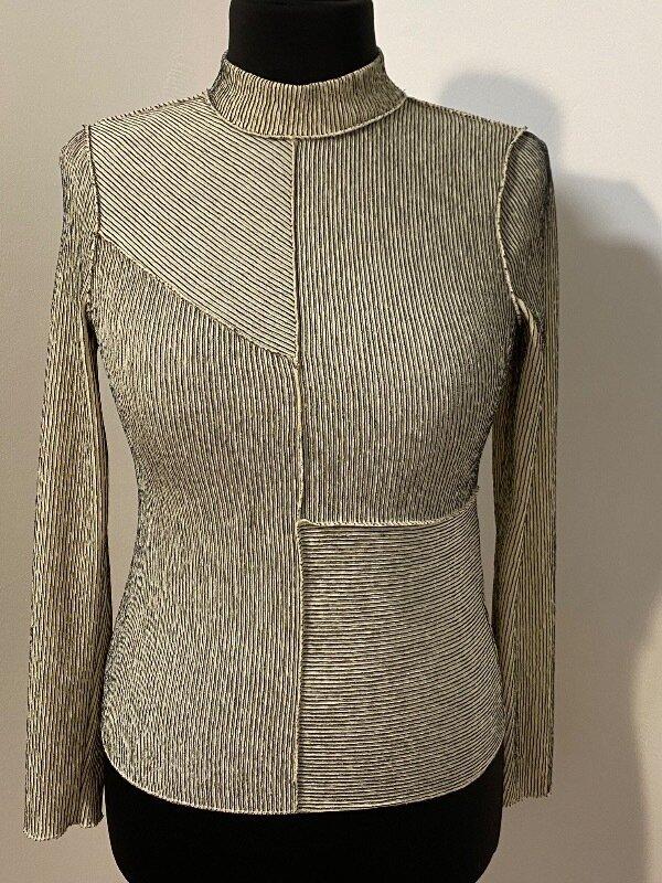 Размер 38 указан, демонстрировано на манекене 52 размера, 78% полиэстер, 22% вискоза, ткань сильно эластичная, цвет шампань в черный рубчик. Длина - 57см, плечи - 38см,рукав от плеча - 64см, пог - 45см, пот - 41см, поб - 45см.