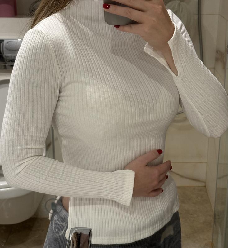 Біла кофтинка з вільною горловиною середнього розміру, та з розрізами збоку і на рукавах . Дуже приємна на дотик, підходить як на xs так і на s