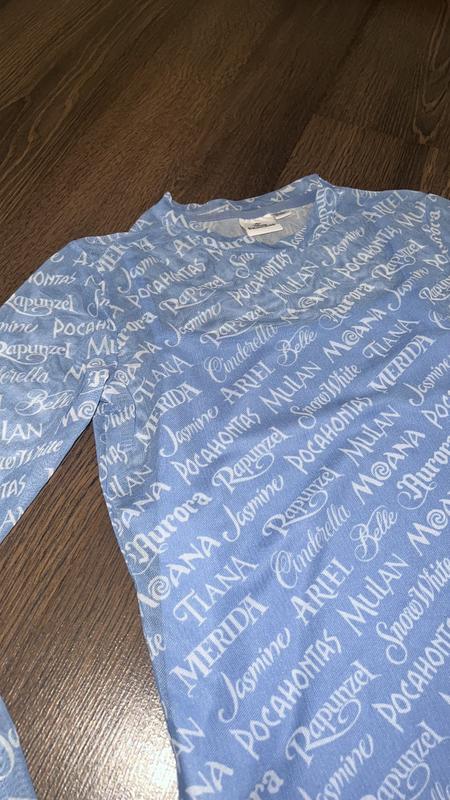 Це блакитна сітчаста водолазка з принтом імен принцес Disney. Стан ідеальний.
