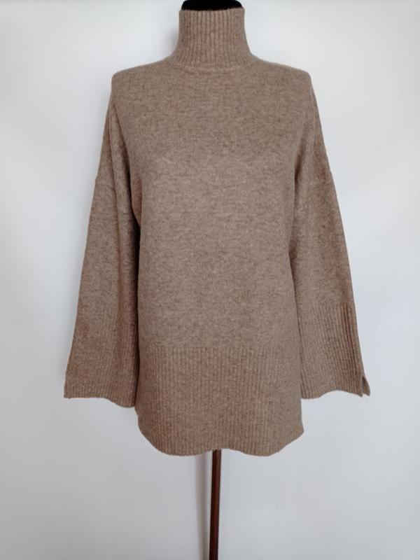 Светер с горловиной стойкой, оверсайз, мягкий приятный на ощупь, теплый с содержанием шерсти, объемный рукав, на вид новый, стоит размер S, но болеемерит. Пог. 60, рукав с начала горловины линия плеча занижена 70, длина 75.