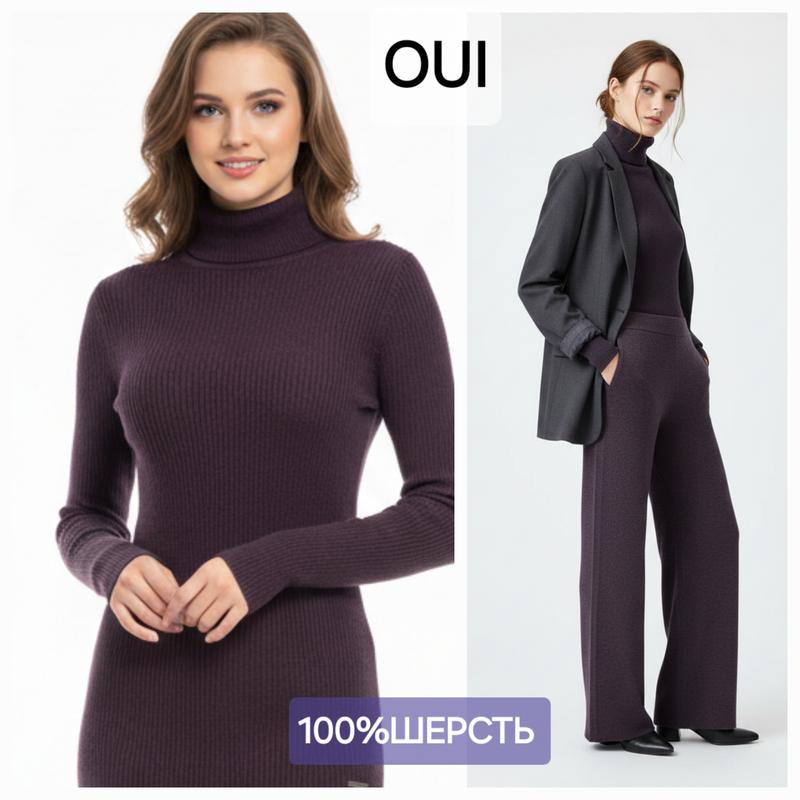 Брендовый нежный невесомый гольф -бадлон/выполнен из мягкой тонкой эластичной шерсти в рубчик/лого бренда/высокая горловина-двойной подворот /глубокого оттенка баклажана/от немецкого бренда OUI Размер указан 38 Замеры ПОГ 36 тянется 60 ДР 69 плечи 30 длина центр спинки 61 +ворот 27 Состав 100%шерсть