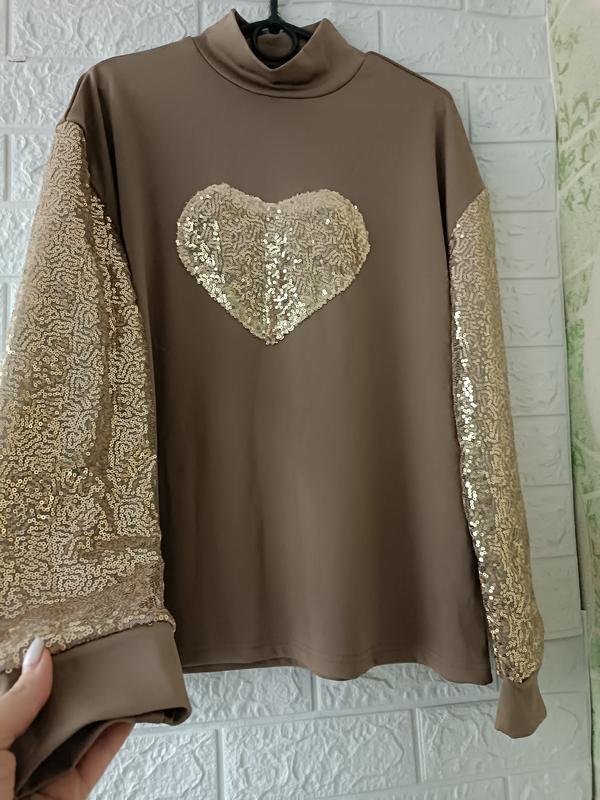 очень красивая водолазка светло-коричневого цвета в пайетки, приятная на ощупь тоненькая, длина 63, п/ г 56, плечи 53, рукав 55.
