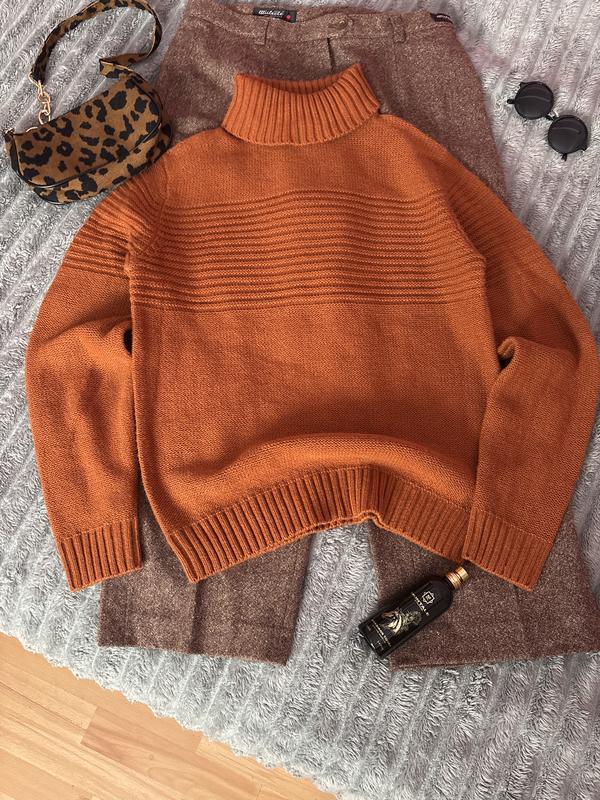 Тканина еластична, м'яка і приємна до тіла, щільна, не колеться. Стан нової речі, без дефектів. Довжина по спинці 61 Пог в спокійному стані 52 до 65 тягнеться Рукав від горловини 75