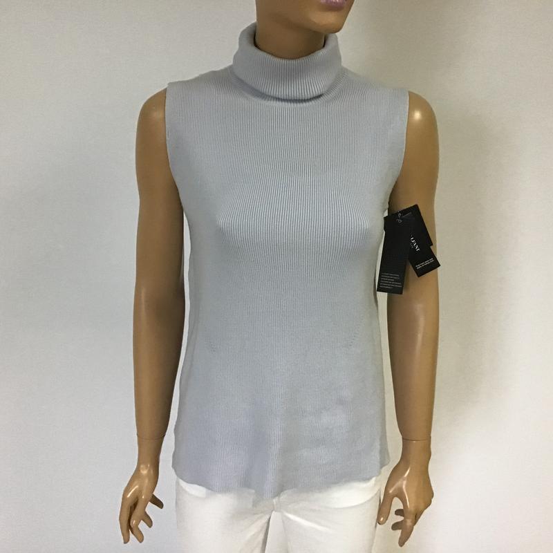 Новий з бірками жіночий гольф без рукавів голубого кольору від відомого американського бренду. Комір стійка .Якісний трикотаж на основі віскози та нейлону. Подовжена спинка. Розширений до низу , по боках розпорки.Елегантно , просто, сучасно. Незамінний предмет жіночого гардеробу. На вішалці він виглядає просто , але із вдало підібраним низом сталрить гармонійне поєднання для різних випадків. Виробництво В‘єтнам. Розмір S Обхват грудей -82см Довжина-55см РозмірL Обхват грудей-96см Довжина - 60см