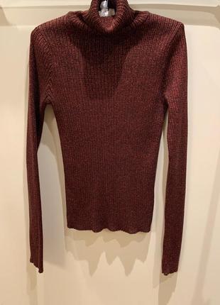 Модный гольф/водолазка с люрексом бордового цвета. Цвет на фото совпалает с реальным, качество классное. Состояние новой вещи, дефектов нет, одевался всего 2 раза. Размер по этикетке - 12 замеры: длина - 57 длина рукава - 67 свитер тянется. Если остались вопросы -пишите! Всегда с радостью отвечу на все Ваши вопросы!