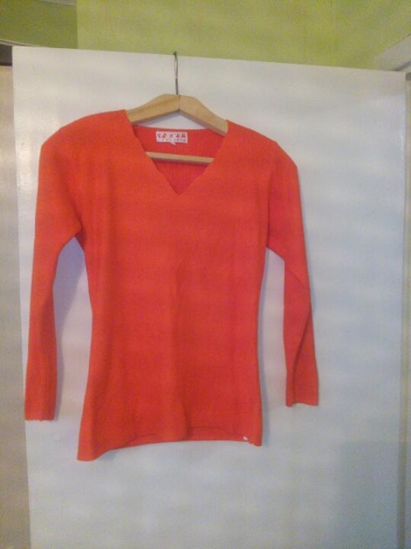 кофточка очень красивого морковного цвета. тел. не передал цвет. есть небольшие катышки. не секонд. длина 62, по груди 45, рукав от нижнего шва 45