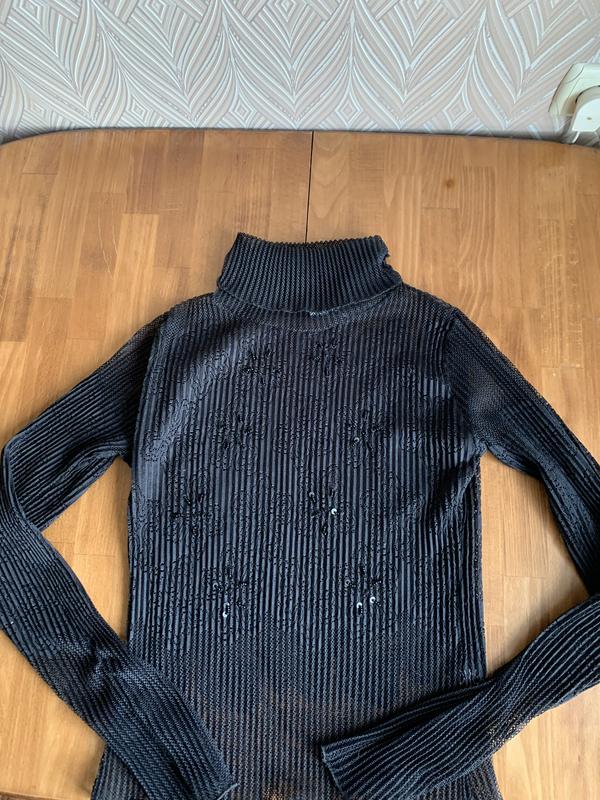 Дуже милий гольф Ніби прозорий але дивиться стильно на чорній білизні Цікавий узор прикрашений паєтками На фото важко передати Рукави на кінцях призібрані Пог 48 Довжина виробу 56 Рукав 72 Насичений чорний