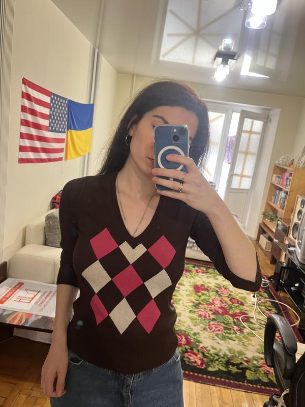 Червона кофта з принтом «ромб», вирізом і рукавом три чверті. Довжина 51 см Довжина рукава 42 см Напівобхват грудей 40 см Напівобхват талії 37 см