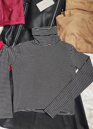 Брендовый гольф в актуальную чёрно-белую полоску. Размер M ( очень хорошо тянется). Длина изделия 45 см. Длина рукава от плеча 62 см.