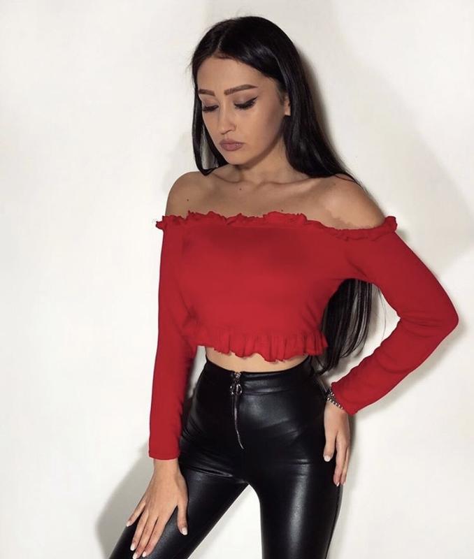 Шикарный кроп топ. Размер хс-с. Состояние лекальной. Справа рюша прямая. Не знаю это нюанс или так было } очень крутой.