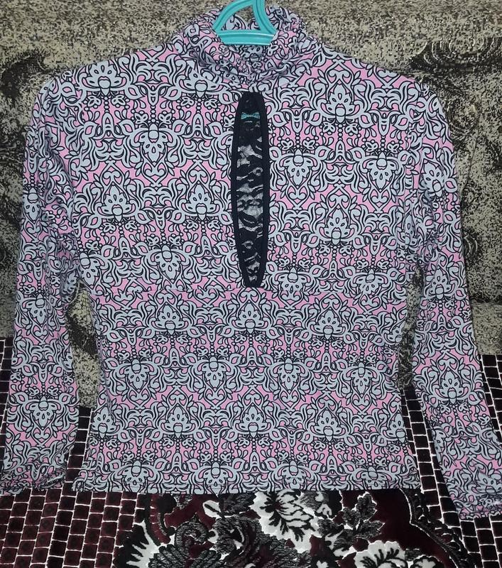 Яркий, оригинальный гольфик в розово - серых тонах. Отрезной под грудью. Воротничок стоечка с резинками. Спереди вырез со вставкой из эластичного кружева. На спинке овальный вырез. Ткань приятная, тянется. Материал хлопок с добавками. Замеры в спокойном состоянии: плечи-43 см, пог -51 см, пот-47 см, по низу-49 см.,длина по спинке- 60 см, длина рукава-60,5 см.