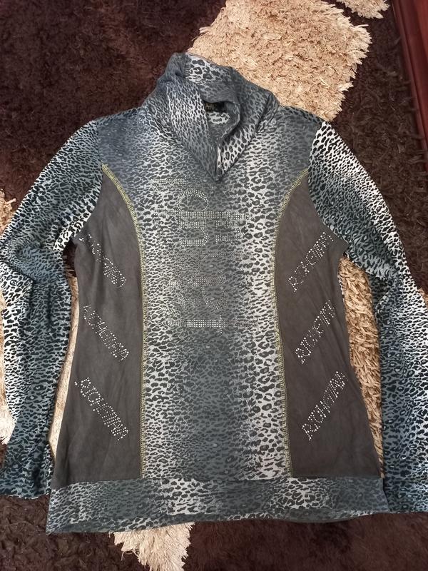 Стильный гольф в принт,декорирован сеточкой и надписями из стразов,вставки по бокам из ткани под замш.Смотрится круто.Не носила.