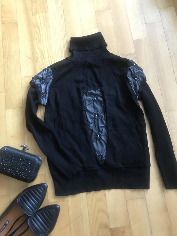 Очень необычный нарядный гольф, декорированный контрастными вставками, с вырезом на груди. В составе 20% шерсти, очень приятный к телу. Размер XS/S Рукав 50см ПОГ 40см Длинна по спинке 52