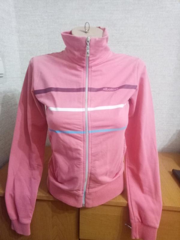 колір рожевий, розмір XS, кишеньки на змеечке, заміри:довжина 54,рукав 60,груди 40, талія 37,низ гумка 36, плечі 36, ще трохи потягнеться