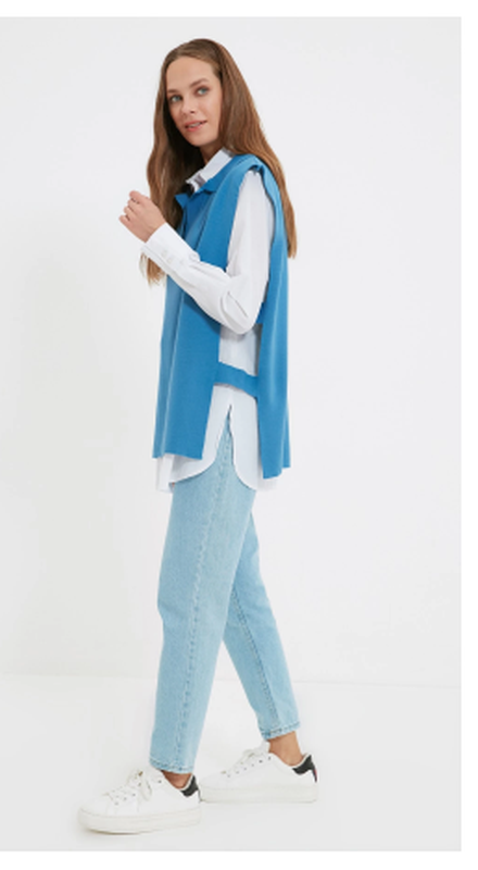 Трикотажний жилет відомої турецької фабрики. Оригінальний зручний модний дизайн. Трикотаж тонкий, але якісний. Виробник називає колір бірюзовим, як на мене - темно-блакитний. Розмір на бірці L, наш 46-48. Заміри: плечі 45 см, бюст з урахуванням смужок 56 см, довжина 70 см.