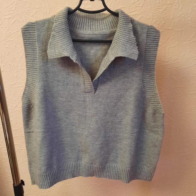 Продам жилет з комірцем,колір сірий,розмір л-хл,склад акрил+поліестер.Заміри довж.62 см,шир.58 см