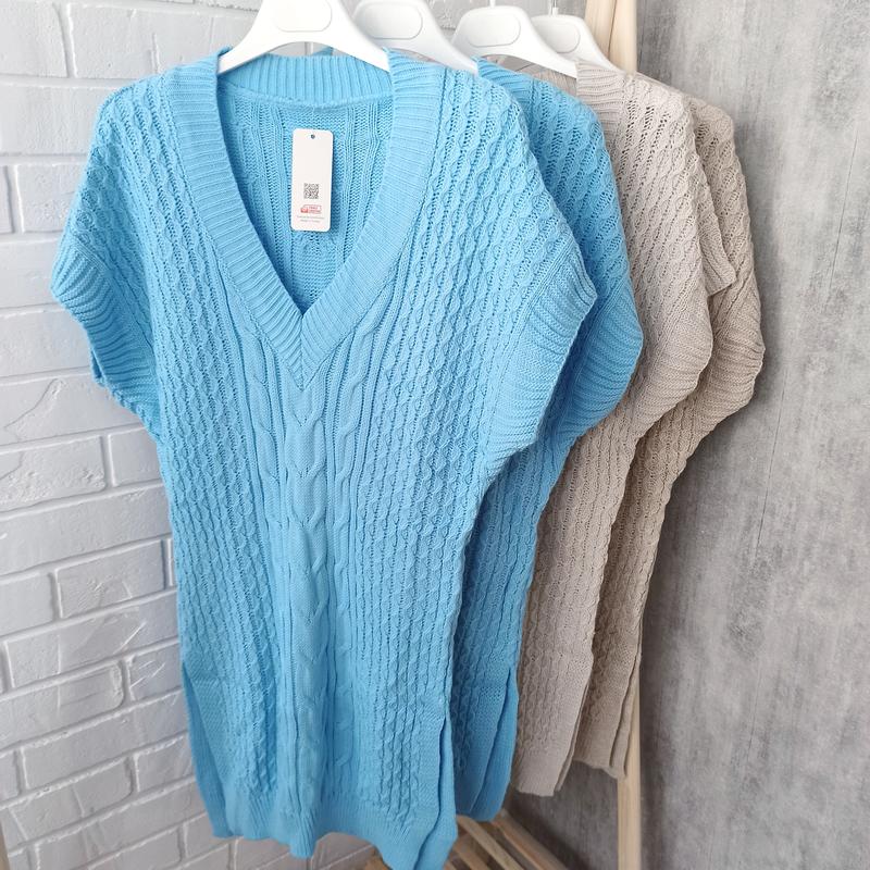 Жилетки в'язані Склад - 70% акрил, 30% шерсть Виробник - Туреччина Розмір - універсальний Кольори в наявності - блакитний, бежевий 🟤Розмір універсальний: Пог - 49 см +тягнеться Пот - 44 см + тягнеться Поб - 44 см + тягнеться Плечі - вільно Довжина по спинці - 85 см