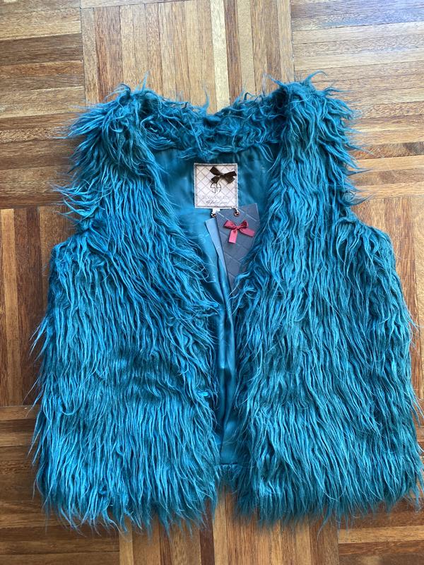 Новый, есть следы примерок, мех синтетический, красивый бирюзовый цвет, на крючках.
