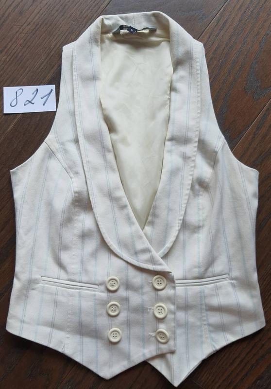 Классическая жилетка в мелкий полоску, ложные карманы. Застегивается на пуговицы. Длина 54см, тянется до 56см От плеча до плеча 22см, тянется до 24см Полуобъем груди 39см, тянется до 44см Полуобъем по низу 38см, тянется до 42см