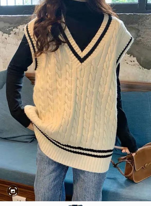 теплый вязаный жилет из 100% шерсти мериноса, молочного цвета с контрастной окантовкой, выполнен плотной текстурой вязкой в косы, горловина, рукав и низ обвязка резинкой, удлиненная модель свободного кроя с широкой проймой, линия плеч приспушена 51, грудь 51, низ 40 макс 60), длина 77, замеры выполнены в спокойном состоянии, хорошо тянется