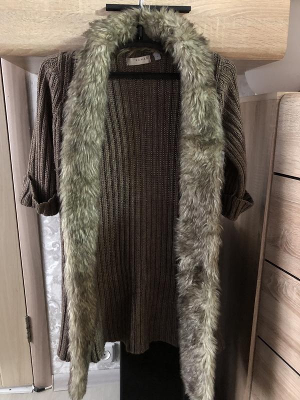 Теплая, вязаная кофта-жилетка с отделкой из искусственного меха