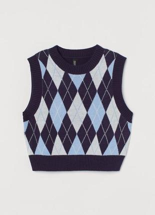 РазмерL Короткий жилет-свитер из мягкой вязки. Круглый вырез горловины и рельефная резинка по вырезу горловины, проймам и нижнему краю.