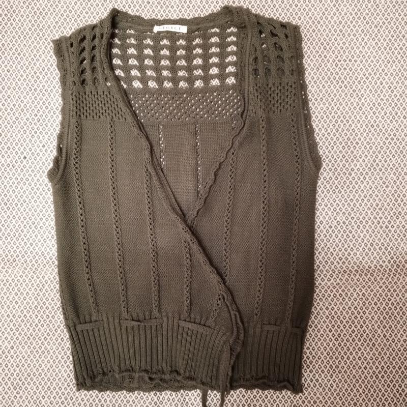 Безрукавка, б/в, на завязке снизу, пуговицах нет, цвет хаки (болотный, не яркий), тянется хорошо