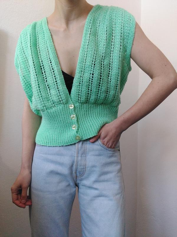 Вязаный жилет в салатовом оттенке Бирки отсутствуют, ручная вязка. Стан - идеальный Размер универсальный Замеры: полуобхват груди - 53 см, длина - 51 см. Одето на размер s