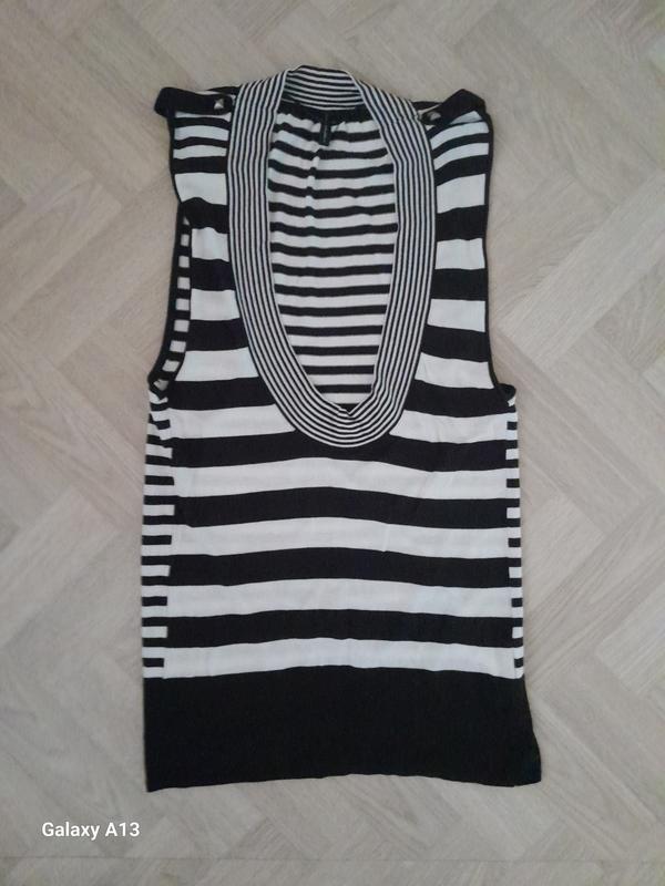 Жилет Naf Naf p.S, M. 60% коттон, 30%вискоза. Очень мягкий. Комбинация полосок разного размера и погрузка делает фгуру на размер более стоучным. Можно носить как самостоятельную вещь, так и с рубашками, водолазками.