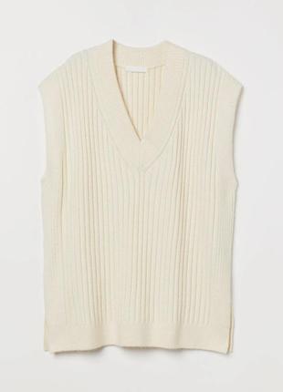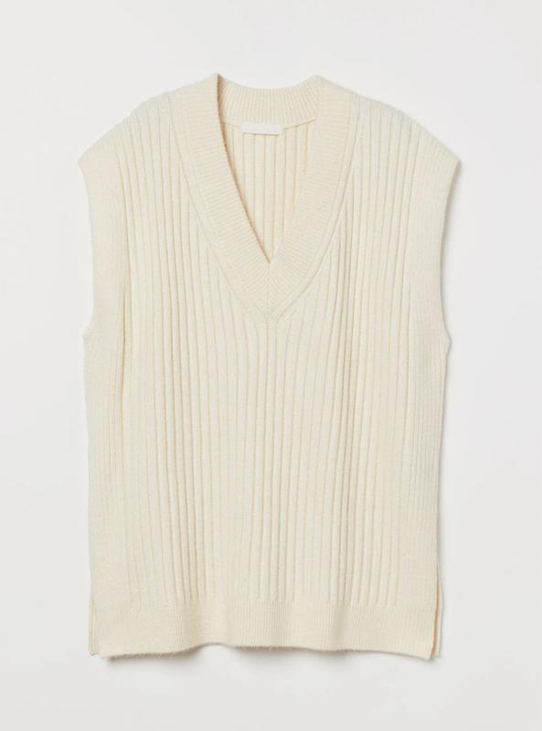 Жилет оверсайз из мягкого трикотажа в рубчик с добавлением шерсти. Глубокий V-образный вырез, низкие плечи и прямой низ.