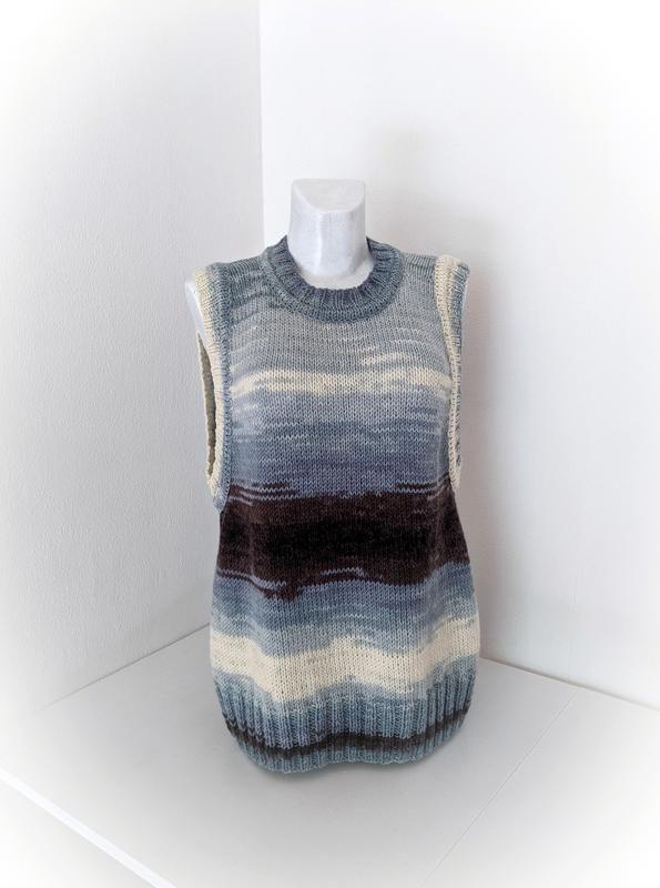 Вязаный спицами из полушерсти длинный жилет. Модный силуэт, интересный переход цвета от белого к темно-синего. Оверсайз, все размеры указаны на фото. Размер манекена на фото - М.