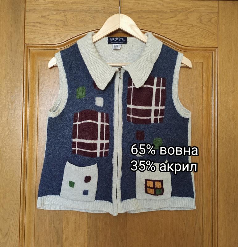 Теплая женская жилетка Aussie girl в идеальном состоянии. Состав: 65% шерсть и 35% акрил. Имеет 2 кармашка. Такая уютная и милая ) Пог - 46 см, тянется до 54 см Длина - 53 см Поб - 50 см, тянется до 58 см **Есть еще одна теплая вязаная жилетка – смотрите в моей Шаффе. Отправлю жилетку после оплаты на карту Приватбанка Новой или Укр-почтой за счет покупателя.