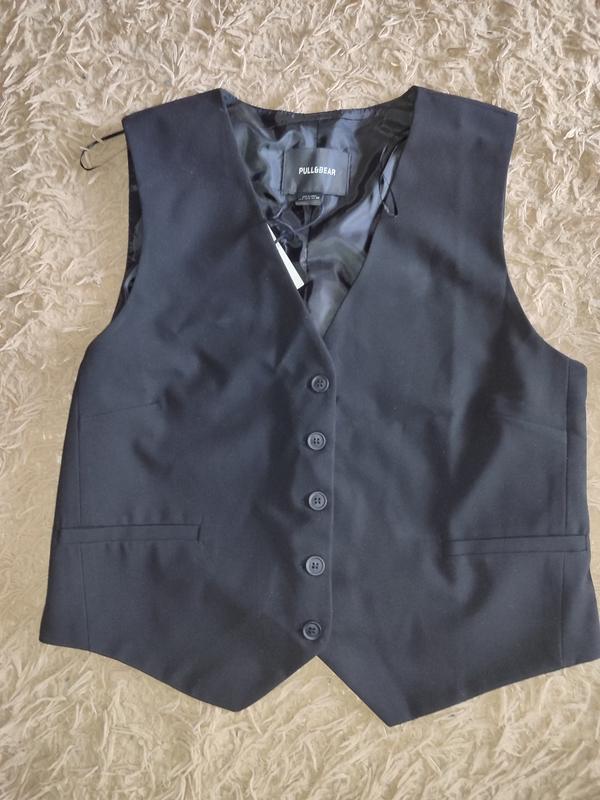 жилетка чорна PULL&BEAR из костюмной ткани с подкладкой имитация карманов размер L на спинке затягивается, с разрезами общая длина по спинке - 49 см пог - 47 см