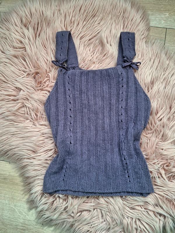 Актуальная теплая жилетка от Miss Selfridge Красивая вязка На широких лямках с бантиками Облегает по фигуре Размер M-L По факту идет на меньше Новая Без нюансов