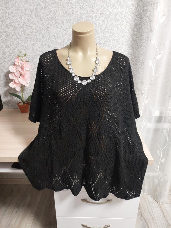 Женская черная, ажурная вязаная кофта, маде ин Italy, размером 4XL, 22-24. В идеальном состоянии, из акрила, мохера, шерсти и полиамида. Легкая с красивым узором из переда, теплая, красиво тянется, приятная к телу, просвечивается. Все замеры на фото. Качество отличное.