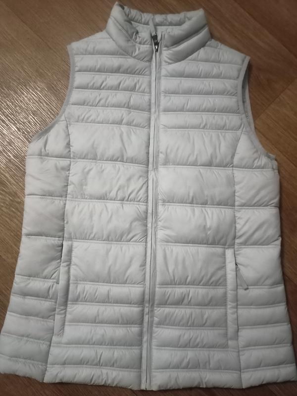 Женский жилет, состояние НОВОЙ вещи ,с двумя карманами на змейке, цвет бледно голубой,светло серый. Пог 45 . Замеры на фото.