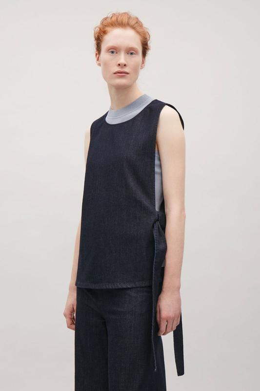 Жилет с открытой стороной, завязанный на пояс-завязку, выполнен из денима. Прямой крой, глубокий круглый вырез, 98% хлопок / 2% эластан.