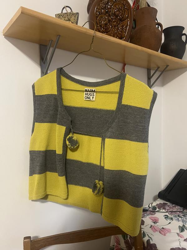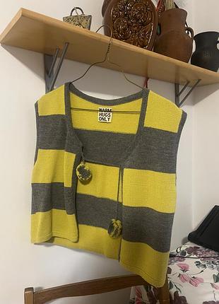 Жилет українського бренду Warm Hugs Only з помпонами, новий, тільки примірявся. Розмір 1 (з двох розмірів вказаних на сайті, найменший) Довжина - 46 см, ширина - 44 см Ціна сайту 4289 грн, продаю за 3000 грн. Опис з сайту: В'язана жилетка виготовлена з італійської пряжі deadstock Звичайна посадка Низька кругла горловина Помпони ручної роботи як застібка 60% мериносової вовни 40% Альпака Жилет має 2 розміри: Розмір1. Довжина - 46 см, ширина - 44 см Розмір2. Довжина - 50 см, ширина - 47 см Зріст моделі 167 см, одягнена в розмір 1 Прати вручну, сушити, не відбілювати Зверніть увагу, що трикотаж допускає похибку вимірювання до 1-2 см. Усі довжини вимірюються вертикально.