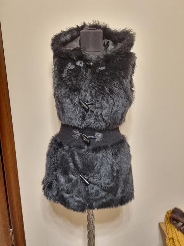 подовжена жилетка з капюшоном з штучного хутра.застібка на гудзиках.на талії вставка з щільного трикотажу.є дві кишені.