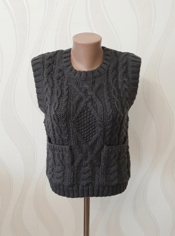 Массивной вязки жилет с карманами. Стан нового. 50% полиэстера, 44% акрила, 6% шерсти. Горловина, пройма и низ изделия - вязках - резинка. Плечо 40см, ПОГ 43, ПОТ 43, ПОБ 39, длина 51см, пройма 21см.