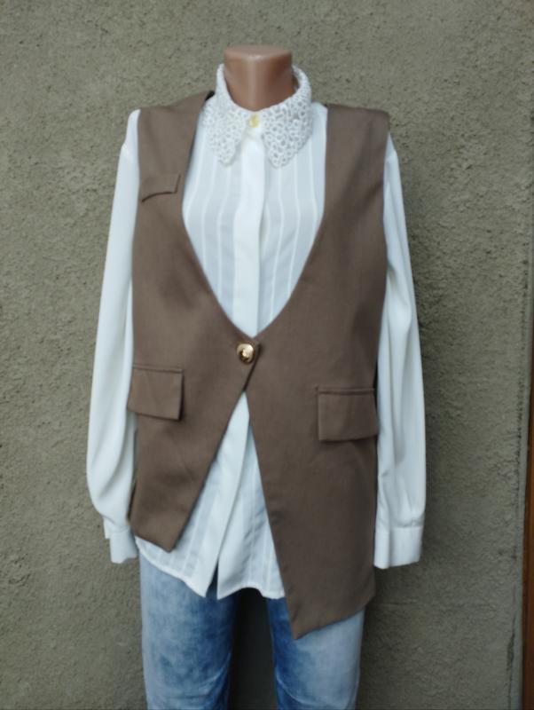 Очень интересный, необычный крой, асимметричный жилет. Выполнен из качественной костюмной ткани, на красивой подкладке, с красивой металлической пуговицей. Отличная работа, но желаемая безымянная. Бирки с составом ткани отсутствуют. Идеальное состояние, как новое. Размер указан М. Замеры: ШП-36 ПОГ-51 ПОТ-50 НОН-52 Длина по спинке -67 см.