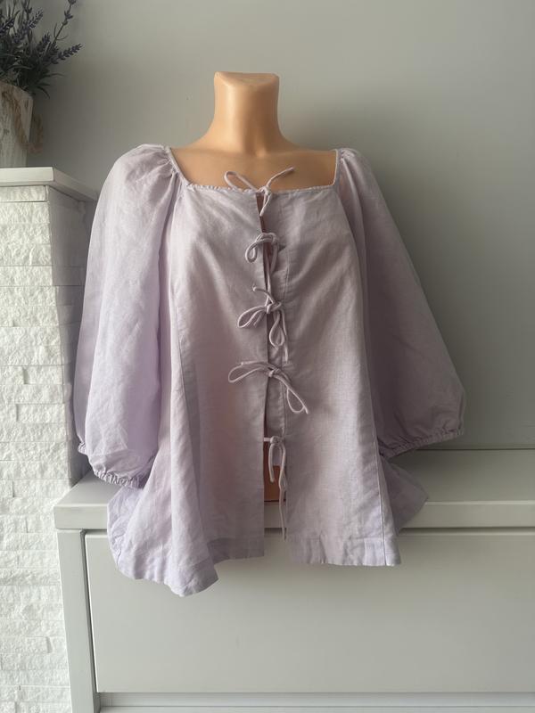 Блуза з льону з зав’язками • Матеріал: натуральний льон — дихаючий, приємний до тіла • Колір: ніжно-бузковий • Фасон: вільного крою, підходить на розміри від L до XXL • Декор: передня частина оздоблена декоративними зав’язками • Рукав: об’ємний, 3/4, зі зборкою на резинці • Горловина: квадратна, злегка зібрана • Довжина виробу: 67 см • ПОГ (напівобхват грудей): 54 см • Стиль: романтичний, бохо • Ідеально підходить: для літніх прогулянок, відпочинку або неформальних подій Блуза виглядає легко та жіночно, гарно комбінується з джинсами, шортами або лляними штанами Не забудьте підписатися на мій профіль,тут завжди можна знайти великий вибір одягу,оновлення щотижня і діють завжди знижки