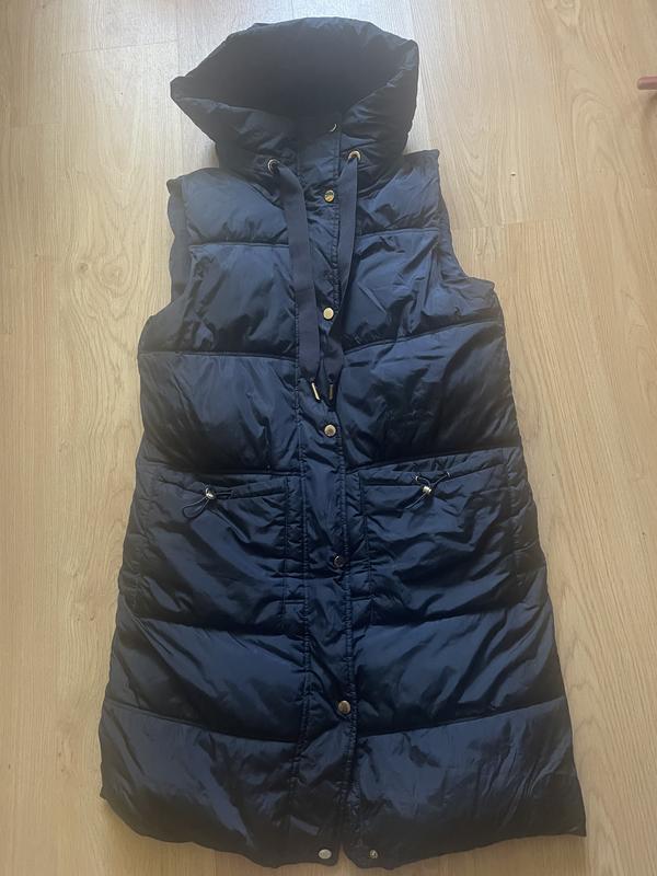 Жіноча довга, тепла жилетка с капюшоном та великими кишенями , розмір на бірці вказаний S, але буде на М.