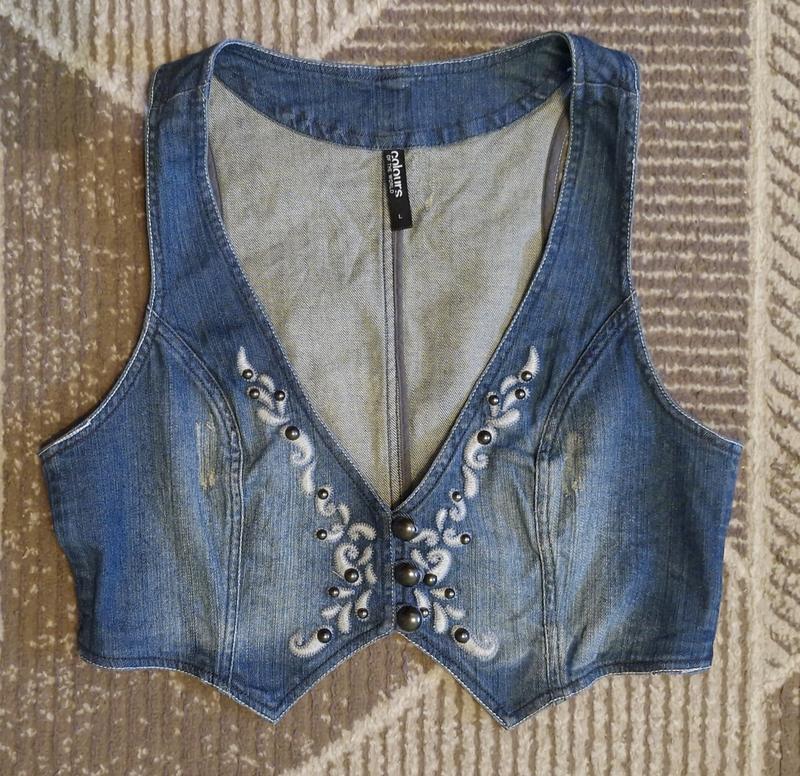 Короткая приталенная джинсовая жилетка, с глубоким вырезом, на пуговицах Жилетка обработана вышивкой, кнопками и потертостями Размер S M Бавовна, еластан Стан идеален, без дефектов С вопросами обращаетесь