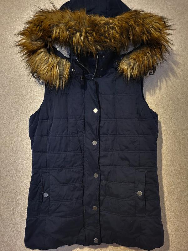Жилетка унисекс на демисезон или еврозиму Капюшон и мех снимается Застежка молния и кнопки Капюшон внутри на меху, воротник вязаный Карманы боковые на кнопках Пог 46 поб 48 длина 62