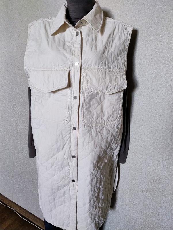 удлиненный жилет, Молочного цвета, новой,на кнопках, с двумя карманами, с разрезами по бокам (подлозь круглыми).Пог 60 см. Длина97 cм.Замвры на фото.