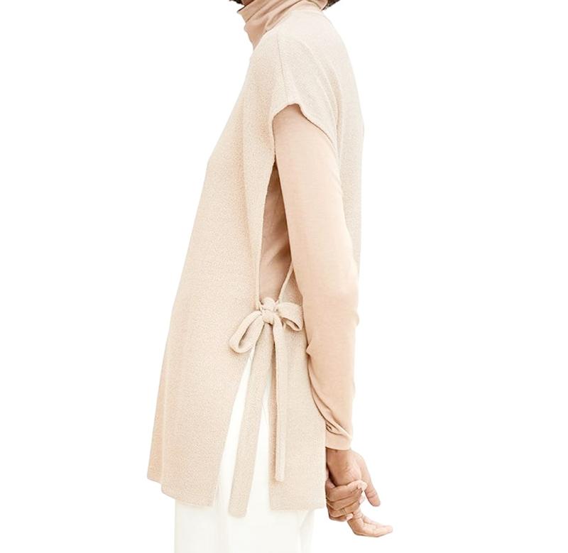 Топ-жилетка H&M молочного цвета, свободного кроя с боковыми завязками и цельными проймами от плеч, мелкой вязки, ткань – выскоза-полиэстер. Параметры: плечи 60 см длина 65 см ширина 50 см